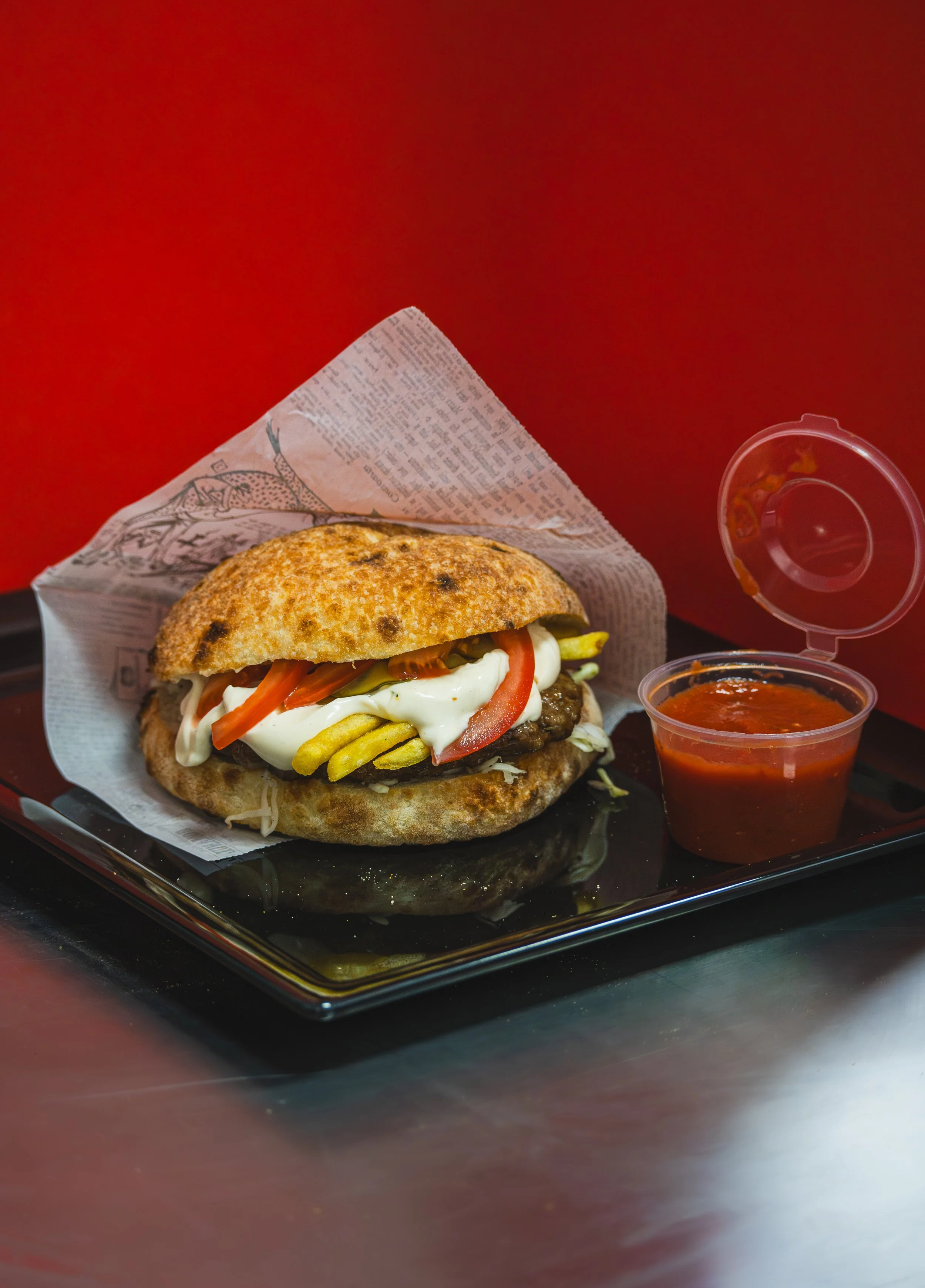 Ingrediente: chifla 170 g, salata verde 10 g, mușchi file 100 g, cheddar 50 g, roșii 25 g, castraveți verzi 20 g, sos la alegere 50 g