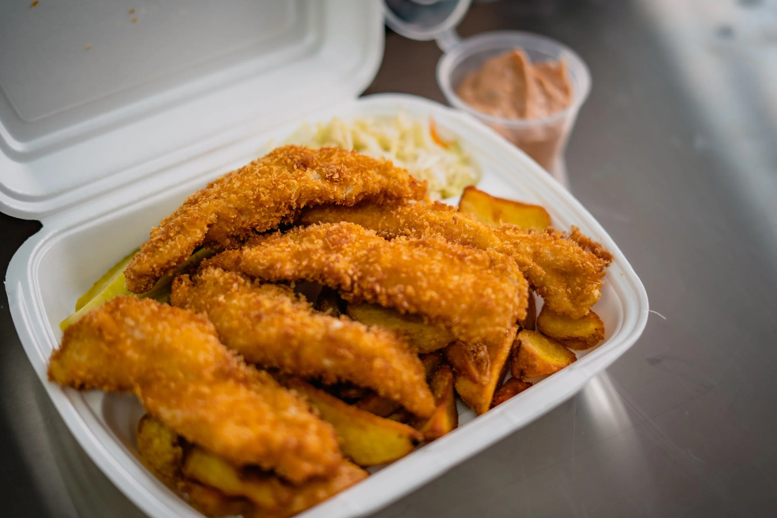 Ingrediente: chifla 170 g, salata verde 10 g, cartofi prăjiți 60 g, schnitzel de pui 100 g, roșii 25 g, sos la alegere 50 g, inele de ceapa 40 g